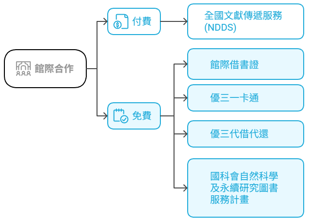 本校師生可向國內外圖書館申請館際合作複印或借書,於全國文獻傳遞服務系統(NDDS)線上提出申請,資料到館後,即以 email 方式通知申請人來本館付費、取件。