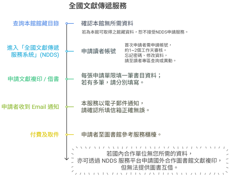 | 6. 若國內合作單位無您所需的資料,亦可透過 NDDS 服務平台申請國外合作圖書館文獻複印,但無法提供圖書互借。 | |