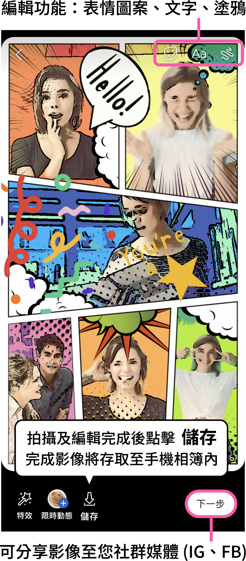 Android : Android手機規格種類較多,建議使用近三年款手機,並將Android/FB/IG版本更新至最新版以獲得正常效果。